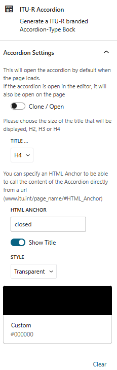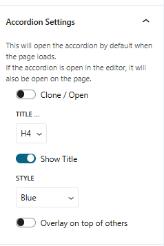- Initial Display Options: Choose whether the accordion loads in an open or closed state, and whether the title is visible or hidden for full transparency.