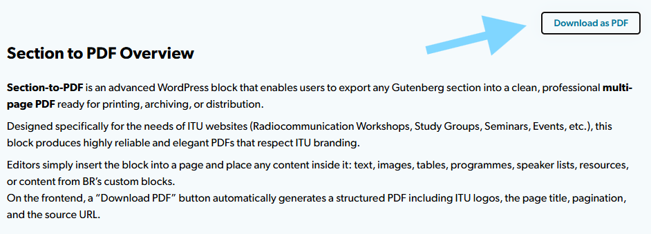 Designed specifically for the needs of ITU websites (Radiocommunication Workshops, Study Groups, Seminars, Events, etc.), this block produces highly reliable and elegant PDFs that respect ITU branding.