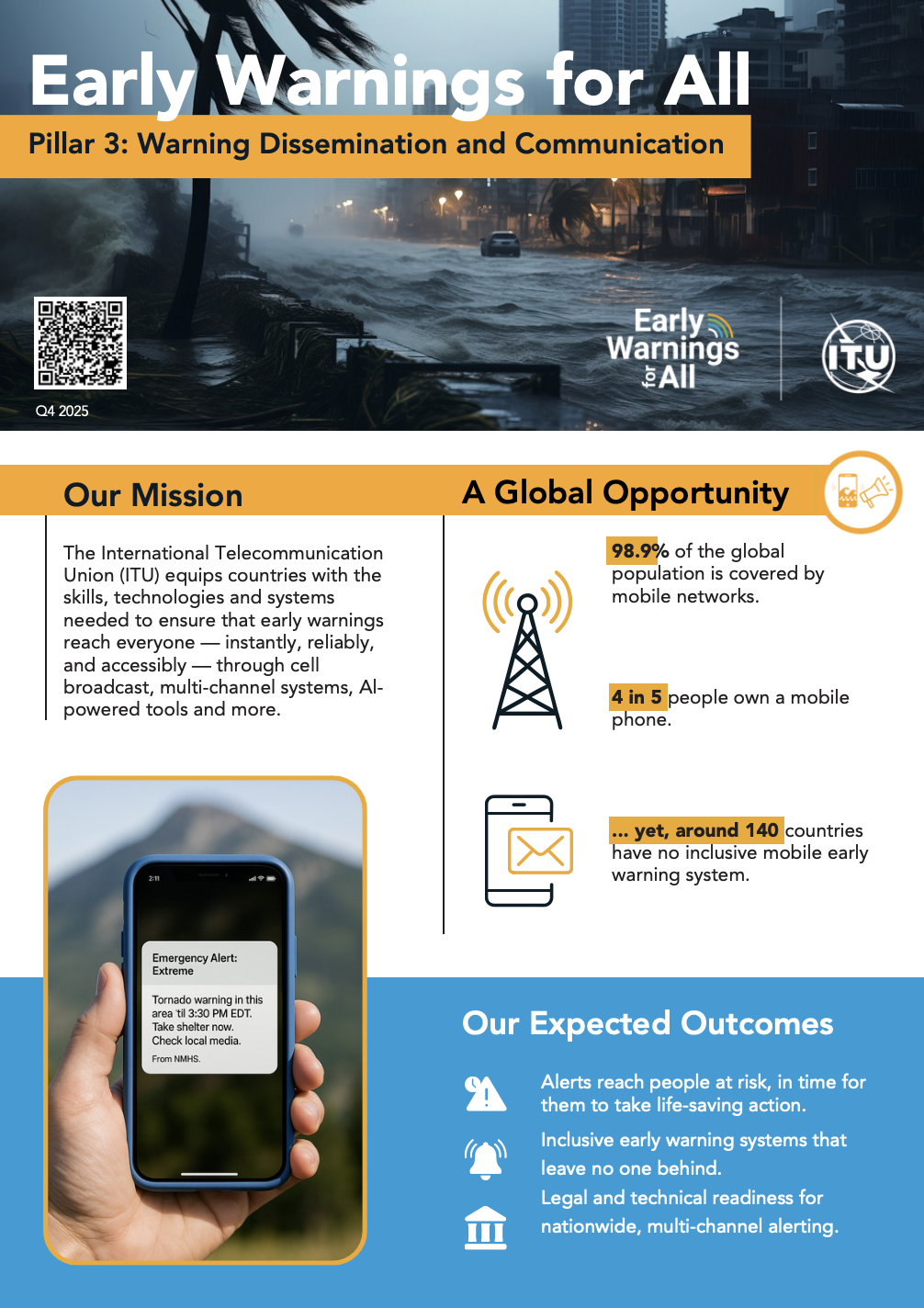 Watch this video to learn about the life-saving potential of mobile early warning systems Our mandate is to ensure that alerts reach all people at risk—timely, reliably, and at scale. This means strengthening last-mile connectivity, integrating multi-channel communication, and ensuring that warnings are trusted, understood, and actionable, especially for vulnerable groups.
