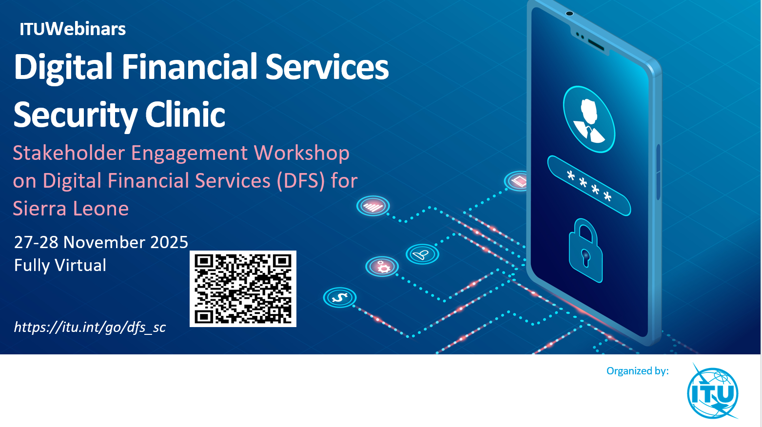 The International Telecommunication Union (ITU) is pleased to invite participants to the Digital Financial Services (DFS) Security Clinic, Sierra Leone, which will take place on 27–28 November 2025, from 10:00 to 13:00 GMT, online via Zoom. The Security Clinic will provide in-depth sessions on the ITU DFS Security Recommendations and the ITU DFS Security Lab activities.
