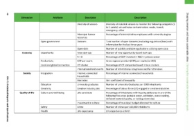 Description Diversity of installed sensors to monitor the following categories (1 to 5 points): air and noise contamination; waste, transit, Percentage of administrative employees with university degree Total number of open datasets (excluding regulations/laws) with Number of publicly available applications utilizing open data Number of new opportunity‐based start‐ups Percentage of GDP invested in R&D in private sector Gross regional product (GRP)