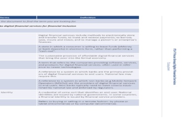 Alternative and Related T erms Ideas or high level abstractions relevant to digital financial services for financial inclusion National Identity , Financial Identity , Digital Identity