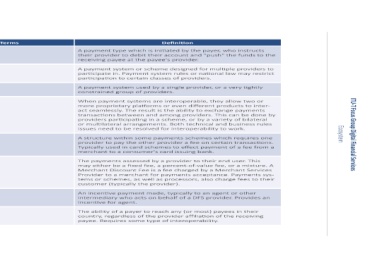 constrained group of providers. merchant to a consumer's card issuing bank. customer (typically the provider). incentive for agent. payee. Requires some type of interoperability.