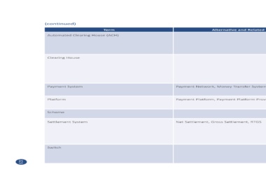 (continued) Automated Clearing House (ACH) Clearing House Payment System Platform Scheme Settlement System Switch