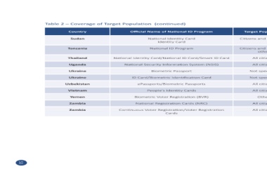 T arget Population Coverage Rate among Y ear of Launch T arget Registration Age T arget Population Not specified 2011 16 Citizens and Residents 24% 2008 Not specified Citizens and residents, other 47% 2005 7 All citizens 99% 2014 16 All citizens ITU-T Focus Group Digital Financial Services