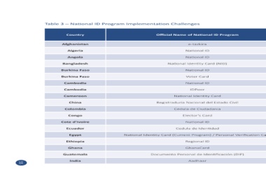 e-tazkira X -- X -- -- -- -- -- -- -- X -- -- -- National ID -- -- X -- -- -- -- National ID -- -- -- -- X -- -- National Identity Card (NID) ITU-T Focus Group Digital Financial Services -- X X X -- -- -- National ID -- -- X -- -- -- -- Cedula de Identidad -- -- X --