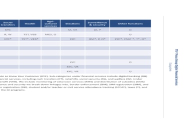 Financial services KYC KYC KYC* KYC KYC, DB* Note: Under many categories of functions, the service involves using an ID to access services, which we denote as Know Your Customer (KYC). Sub-categories under financial services include digital banking (DB) and mobile money (MM). We separately consider several sub-