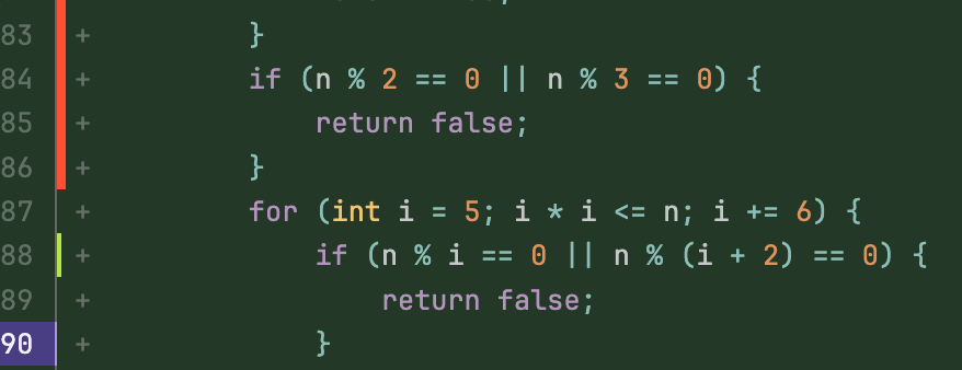 In this example, lines 83-86 show red bars for uncovered code, line 88 shows a green bar for covered code, and lines 87, 89-90 have no coverage data.