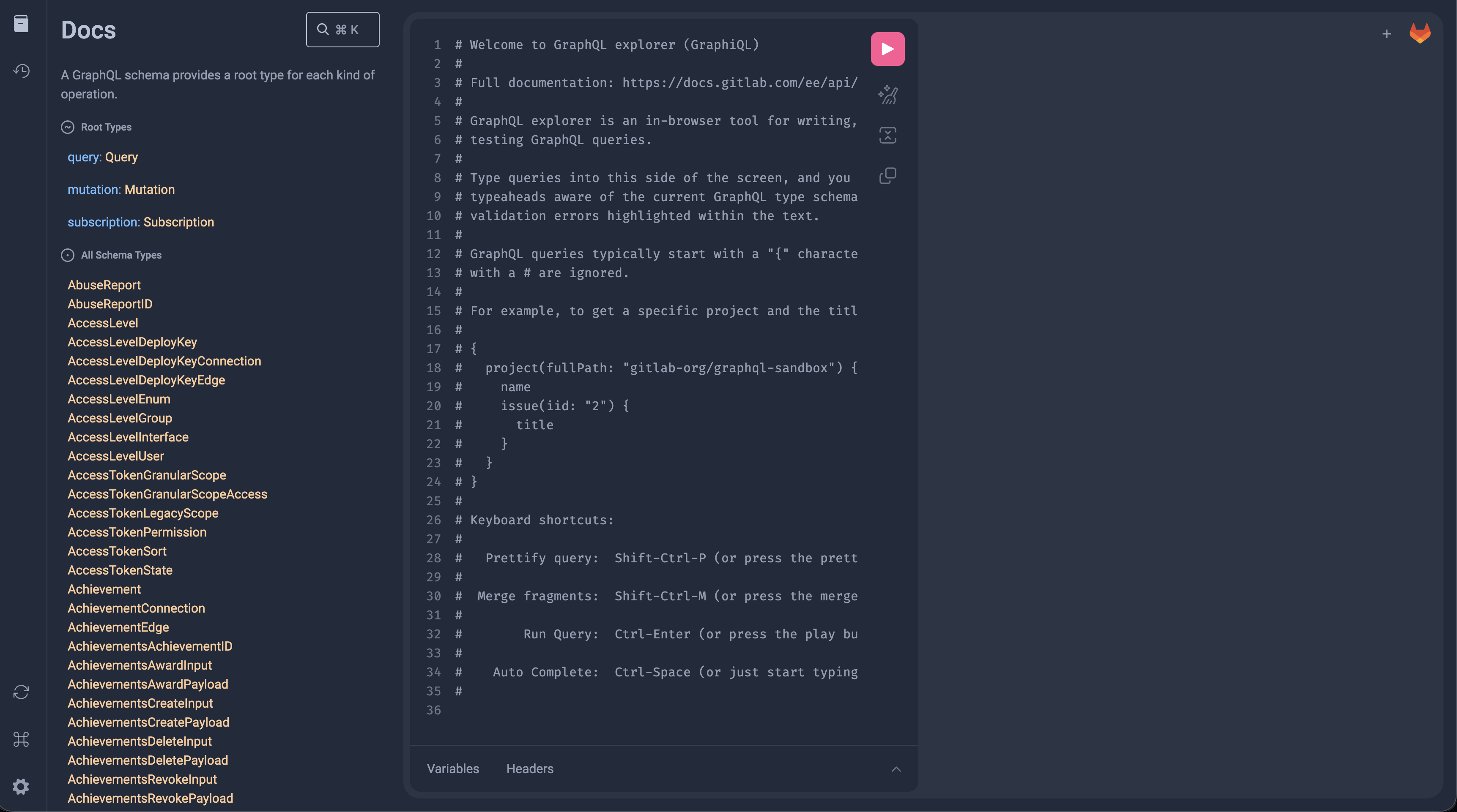 To view all available queries and mutations, on the left side of GraphiQL explorer, select Show Documentation Explorer. To execute queries and mutations you've written, in the upper-right corner, select the play button labled Execute query.