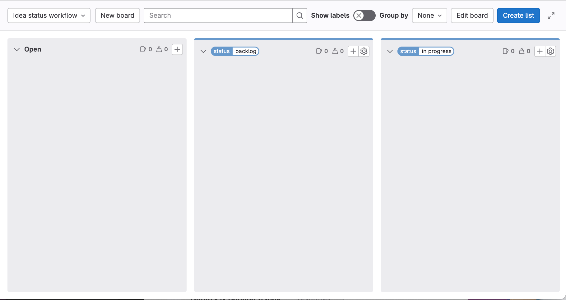 To prepare for the incoming ideas, create an issue board that organizes ideas by label. You'll use it to quickly create issues and add labels to them by dragging cards to various lists.