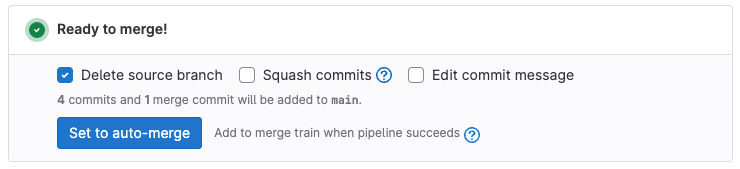 If the content of a merge request is ready to merge, you can select Set to auto-merge. The merge request auto-merges when all required checks complete successfully, and you don't need to remember to manually merge the merge request.