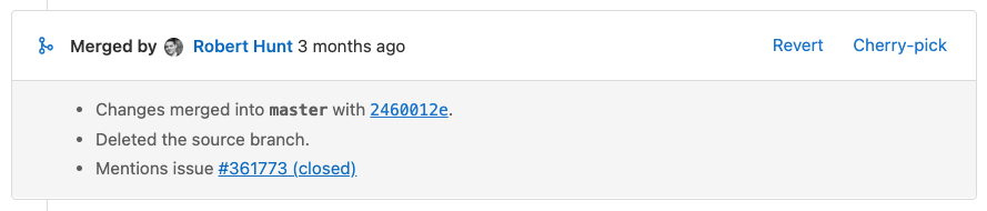 When you cherry-pick a merge commit in the GitLab UI or API, GitLab adds a system note to the related merge request thread.