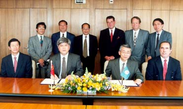 Ceremonia de firma. De izquierda a derecha, en primer plano: Anthony Wong, representante del Gobierno de la Región Administrativa Especial de Hong Kong de China, el embajador Zonghuai Qiao, representante permanente de la República Popular de China ante las Naciones Unidas en Ginebra y otros organismos internacionales en Suiza, Yoshio Utsumi, secretario general de la UIT, y Roberto Blois, vicesecretario general de la UIT. En segundo plano: Xianguo Tong, primer secretario, Misión Permanente de la China en Ginebra, Benji Sun, director, Ministerio de la Industria de la Información, Wenchu Qu, subdirector general, Ministerio de la Industria de la Información, y consejero de China ante la UIT, Jean-Patrick Baré, presidente de TELECOM, Tom Dahl-Hansen, vicepresidente primero de TELECOM y jefe de la División de Desarrollo Comercial y Comercialización, y Zhenyi Hou, consejero, Misión Permanente de la China en Ginebra