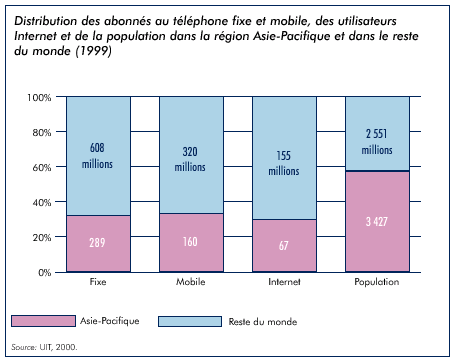 Représentant un tiers environ du marché mondial des télécommunications (en fonction du nombre d'abonnés et d'utilisateurs des réseaux fixe, mobile, cellulaire et Internet), la région Asie-Pacifique compte en outre près de 60% de la population mondiale, ce qui lui confère un potentiel considérable.