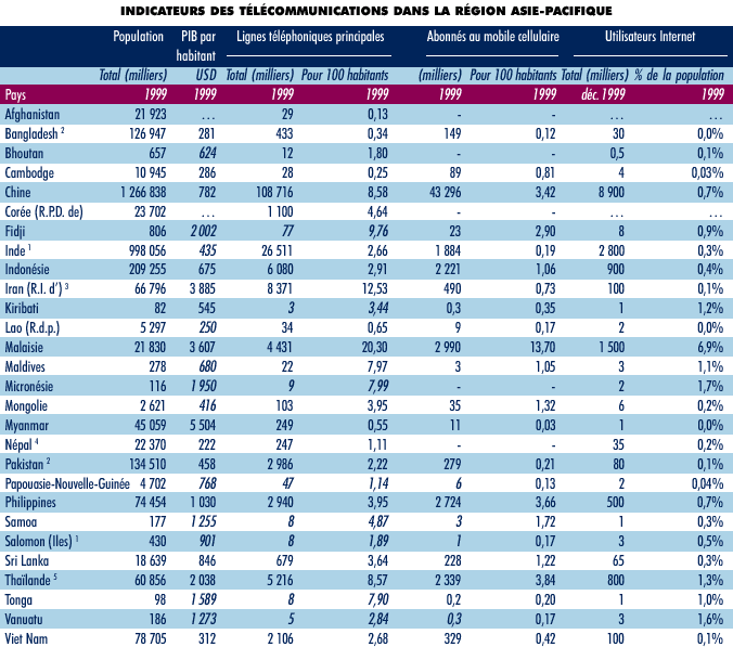 En dépit d'une croissance économique zéro en 1997 et en 1998, les pays en développement de la région ont enregistré une croissance continue de leurs réseaux de télécommunication, notamment de leurs réseaux Internet et mobiles: cinq des dix principaux marchés Internet au monde se trouvent maintenant dans la région et, pour ce qui est du nombre d'abonnés mobiles, la Chine et le Japon sont respectivement classés aux deuxième et troisième rangs de tous les pays. Les réseaux fixes ont eux aussi connu une croissance, quoique moins rapide.