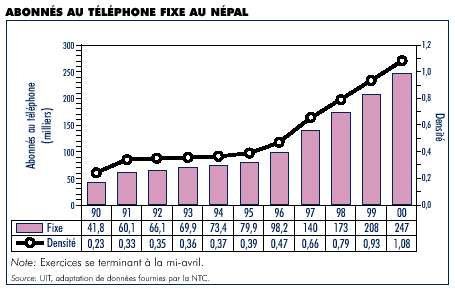 Dans la deuxième moitié des années 90, la croissance au Népal a été aussi rapide, voire plus, que dans tout autre pays d'Asie du Sud, malgré l'absence d'investissements étrangers. Une étape importante a été franchie en 1999 lorsque la densité téléphonique a atteint le cap d'une ligne pour 100 habitants. Le service téléphonique est disponible dans la totalité des 75 districts, dont 65 disposent de leur propre centrale, les autres étant desservis par satellite ou par voie hertzienne. Il reste cependant beaucoup à faire avant de pouvoir desservir totalement ce pays montagneux et rural, les deux tiers des téléphones se trouvant en effet dans la région de Katmandou. On dénombre 275 000 demandeurs en liste d'attente et 60% environ des Comités de développement de village n'ont pas encore le téléphone.