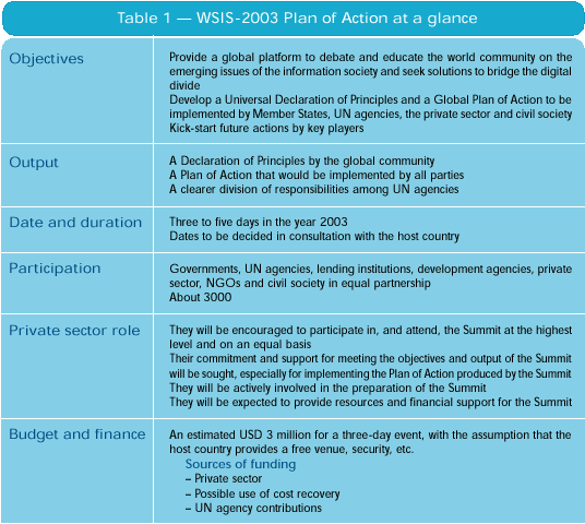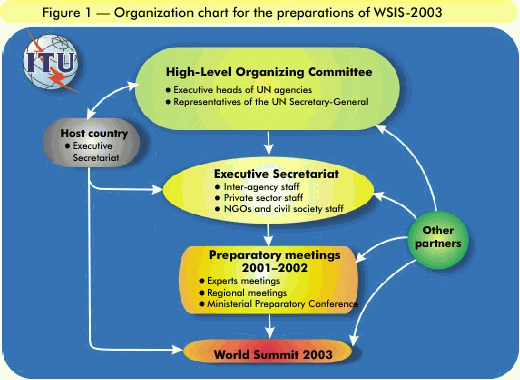 At the end of October 2000 Mr Utsumi, who was accompanied by Mr Harbi, Head of ITU's Strategic Planning, External Affairs and Corporate Communication Units, informed ACC of the positive reaction from the public and private sectors to the decision of the ITU Council to convene WSIS-2003. He also spoke of the next steps and presented a draft Plan of Action (see Table 1), along with an organization chart (see Figure 1) and the mandates for HLSOC and its Executive Secretariat, which will be set up in early 2001. Many executive heads of international organizations have already accepted membership to HLSOC (see Table 2).