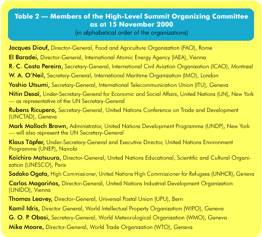 The creation of HLSOC follows on the heels of a meeting between the two leaders in New York at the end of September 2000. Both stressed the need for Heads of State, executive heads of United Nations agencies, industry leaders, non-governmental organizations (NGO), media representatives and partners from civil society to be part of the Summit and to shape the future.
