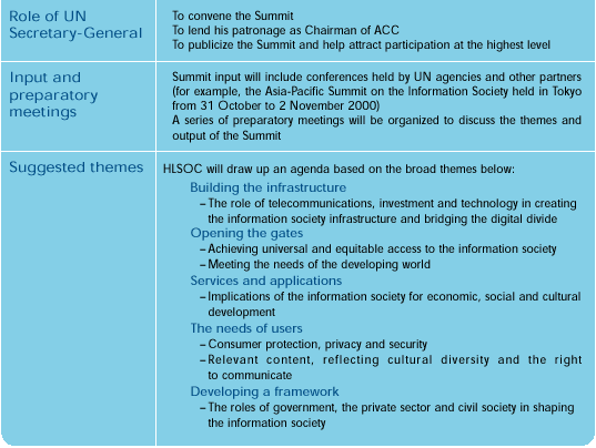 Much has happened to shape the Summit preparations since ITU's governing body, the Council, gave its go-ahead for this massive undertaking in July 2000. In particular, a High-Level Summit Organizing Committee (HLSOC) has been set up under the patronage of the Secretary-General of the United Nations, Kofi A. Annan, in his capacity as Chairman of the Administrative Committee for Coordination (ACC)*. ITU Secretary-General, Yoshio Utsumi will serve as Chairman of HLSOC.