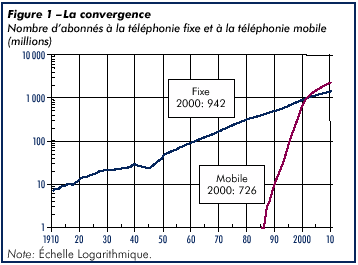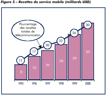 La téléphonie mobile représente une part croissante de la valeur globale du marché des télécommunications. En 2000, elle a généré 273 milliards USD, soit près d un tiers des recettes totales réalisées à l échelle mondiale par le secteur des télécommunications (voir la figure 5). En moyenne, un abonné à la téléphonie mobile cellulaire représente une entrée mensuelle de 39 USD.
