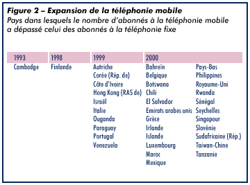 Aux taux de croissance actuels, il y aura davantage d'abonnés au téléphone mobile qu'au téléphone fixe vers le milieu de la décennie (voir la figure 1). Cette transition a déjà eu lieu dans 35 marchés – développés ou en développement (voir la figure 2). Pour un grand nombre d'entre nous, le portable est en passe d'instaurer un nouveau mode de vie sans les contraintes du téléphone fixe. On constate à cet égard une certaine stagnation, voire une diminution, du nombre d'abonnements à la téléphonie fixe dans les foyers à mesure que les usagers optent pour les télécommunications mobiles.