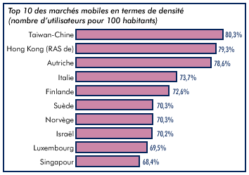 Contrairement à la téléphonie fixe qui plafonne en général aux environs d'un téléphone pour deux habitants, la téléphonie mobile n'a pas encore atteint sa limite. C'est à Taiwan-Chine que son taux de pénétration est le plus élevé (voir la figure 3): on y comptait moins de 100 000 téléphones portables il y a dix ans, alors qu'aujourd'hui quatre Taiwanais sur cinq en possèdent un. Le nombre d'abonnements à la téléphonie mobile a augmenté de 25% en 2000 dans les dix premiers pays (Top 10) où les télécommunications hertziennes sont les plus développées. A ce rythme, la plupart des consommateurs adultes auront bientôt au moins un téléphone portable.