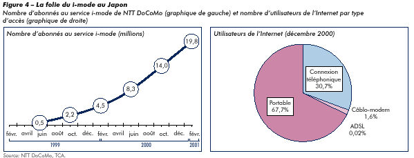La tiédeur avec laquelle le WAP a été accueilli contraste de façon frappante avec l'expérience du Japon dans le domaine des services Internet mobiles. Le Japon a en effet été le premier pays à offrir ce nouveau type de prestation, lorsque l'opérateur NTT DoCoMo a lancé son service i-mode le 22 février 2000. En un an, i-mode a attiré 5 millions d'utilisateurs. Six mois plus tard, ce chiffre avait plus que doublé et, à la fin mars 2001, environ 22 millions de personnes y étaient abonnées. Il existe deux autres services de ce type au Japon, EZWeb et J-Sky, exploités par des concurrents de NTT DoCoMo. A eux trois, ces services comptaient 35 millions d'abonnés en mars 2001, ce qui signifie que 70% des internautes japonais se connectaient au réseau à partir d'un téléphone portable (voir la figure 4). En fait, NTT DoCoMo se classe, après America Online, au deuxième rang des prestataires de services Internet les plus importants du monde. L'un des attraits du service i-mode est que les sites web HTML peuvent aisément y être adaptés, ce qui n'était pas le cas avec le WAP. NTT DoCoMo héberge 1600 sites sur le portail de son service i-mode. Il y a en outre environ 40 000 sites compatibles avec ce service. Autre raison de son succès, le service i-mode est «toujours branché» et il est facturé sur la base des informations téléchargées et non en fonction du temps d'utilisation.