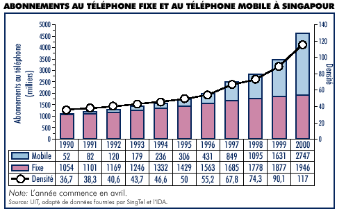 La quasi-totalité des ménages de Singapour disposent d'un téléphone fixe, voire d'une deuxième ligne pour 18,9% d'entre eux et plus de la moitié des ménages ont un téléphone portable. En juillet 2000, le nombre des abonnés à la téléphonie mobile a dépassé celui des abonnés à la téléphonie fixe. Les trois opérateurs cellulaires de l'île ont lancé des services Internet mobiles fondés sur le protocole d'application hertzienne (WAP). En avril 2001, l'Infocommunications Development Authority of Singapore (IDA), organisme national de réglementation des télécommunications, a accordé à ces trois opérateurs des licences d'exploitation de fréquences pour des systèmes mobiles de troisième génération.