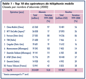 Les réseaux IMT-2000 contribueront à la mondialisation de l industrie des télécommunications mobiles. Pour la première fois, en effet, il existera une norme mondiale, ce qui renforcera donc la mobilité et l interfonctionnement. On observe dans cette branche un nombre croissant de fusions, d acquisitions et de partenariats, phénomènes qui vont probablement s intensifier à mesure que les opérateurs s orienteront vers la création de réseaux mondiaux. En 2000 d ailleurs, deux du Top 10 des opérateurs nationaux de téléphonie mobile étaient nouveaux, Verizon et Cingular, issus de la fusion d entreprises nord-américaines de téléphonie cellulaire. Deux autres, Mannesmann et Omnitel, appartiennent au groupe Vodaf one (voir le tableau 1). Autre indicateur de l essor des télécommunications mobiles, il y a désormais davantage d abonnés à la téléphonie mobile que d utilisateurs de l Internet ou d ordinateurs personnels dans le monde. Faut-il en déduire, à l heure de l Internet mobile, que tous les détenteurs d un téléphone mobile seront aussi des internautes? Tel est en tout cas le pari que font les opérateurs de la téléphonie mobile, notamment en Europe où 105 milliards USD ont été consacrés à l acquisition de licences IMT-2000 (voir le tableau 2).
