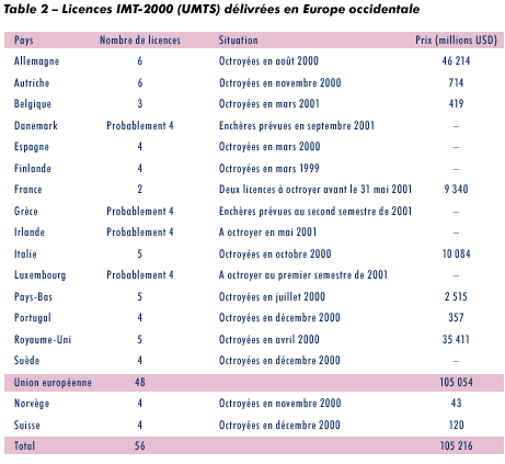 La téléphonie mobile est maintenant à la veille d'une nouvelle révolution: les réseaux mobiles 3G. L'événement fera date pour deux raisons. D'une part, ce sera la première fois que l'on disposera d'une norme mondiale pour les réseaux mobiles. Jusqu'ici, en effet, les systèmes mobiles reposaient sur différentes normes nationales ou régionales: il n'en existe aujourd'hui pas moins d'une douzaine dans le monde. Cette diversité a eu un effet négatif sur la compatibilité et sur les prix. D'autre part, grâce à ces nouveaux réseaux, l'accès Internet à large bande sera désormais une réalité. Cette nouvelle norme est connue sous le nom d'IMT-2000, appellation créée par l'UIT. Adoptés par la communauté mondiale des télécommunications en novembre 1999, les systèmes IMT-2000 offriront des largeurs de bande importantes ainsi qu'un débit minimum de 144 kbit/s ou de 2 Mbit/s dans des conditions de faible mobilité. Favorable dès la première heure aux réseaux 3G, l'Union européenne a engagé ses membres à délivrer rapidement des licences d'exploitation pour ces systèmes et à mettre en service des réseaux au plus tard avant janvier 2002. La plupart des pays d'Europe occidentale ont octroyé des licences IMT-2000 l'année dernière (voir le tableau 2).