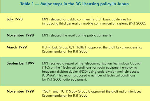 The main elements of the report, which the Telecommunication Technology Council (TTC) submitted to MPT in September 1999 (see Table 1), are highlighted below. Typically, TTC reports provide the technical basis for ministerial regulation.
