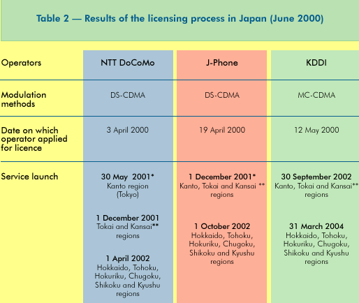 *Both NTT DoCoMo and J-Phone applied for an extension of the launch date. First, J-Phone announced that it would delay the commercial launch of its services by six months. Then, NTT DoCoMo, expected to be the first operator to launch 3G services in Japan, announced that it would postpone the commercial launch of its 3G FOMA (freedom of mobile multimedia access) service from May to 1 October 2001. Meanwhile, it has been running an introductory FOMA service in the Tokyo area from 30 May 2001 to 30 September 2001 in order to assess system performance and provide customer feedback ahead of the October launch. **Kinki region is also known as Kansai. Source: Adapted from MPHPT.