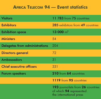 AFRICA TELECOM 94 was the third regional ITU Telecom event for the African region, and far bigger than the preceding two events. Both the Exhibition and Forum were held at the Cairo International Conference Centre.