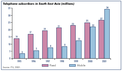The mobile boomSouth East Asia. At the end of the year 2000, there were 22 million mobile subscribers in the region, up from just 3 million five years earlier. At the end of 2000, half of the ASEAN countries — Brunei Darussalam, Cambodia, Malaysia, Philippines and Singapore — had more mobile than fixed telephone subscribers. Thailand joined this group in 2001 and by year-end, there will be more mobile than fixed telephone subscribers in the region as a whole. Under the most conservative estimate — an annual growth rate of just over 10 per cent a year — there will be a minimum of 100 million mobile subscribers by the end of 2010 for a penetration of 16 per cent of the region’s population. As elsewhere around the world, mobile cellular communications is booming in Mobile is a supplement to conventional fixed telephones in the region’s wealthier nations such as Brunei and Singapore; and to a lesser extent in Malaysia. In Singapore, 51 per cent of households had a mobile phone in 1998 even though 98 per cent already had a fixed telephone. Mobiles are a substitute for voice communications in other countries such as Cambodia and the Philippines. In these two countries, a minority of households have a fixed telephone line and mobile phones outnumber fixed telephones. Both have had a greater number of nationwide mobile operators than other countries in the region. Mobile Internet development in the region has been slow. One factor working in the region’s favour is that all the countries have adopted the digital GSM standard. Common standards should help simplify the migration to 2.5 and to third generation (3G) mobile networks. Although most countries have introduced wireless application protocol (WAP) and several have introduced or are launching higher speed GPRS networks, take-up has been lukewarm. This is due to consumer indifference. In some Indochina peninsula countries, there have been problems in adopting native languages to mobile phone text applications. So far, only Singapore has licensed 3G mobile operators. In the other countries, recent GSM licensing and the launch of 2.5 generation systems is likely to delay the introduction of 3G. The Philippines has been at the forefront of short messaging services (SMS). In December 2000, Filipinos were sending almost 50 million text messages a day or around nine per subscriber. They are the world leader in per capita SMS usage, accounting for some 10 per cent of all worldwide SMS messages.