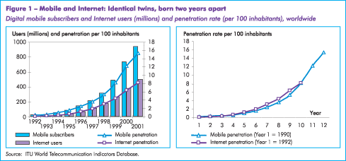 The Republic of Korea has one of the fastest-growing mobile penetration rates in the Asia-Pacific region: mobile phone subscribers topped 29 million at the end of 2001, representing over 56 per cent of total telephone subscribers, with a mobile penetration of 60.84 per cent. It has also been estimated that some 59 per cent of Korean mobile subscribers already have phones equipped with mobile Internet browsers, although, according to some analysts, actual mobile Internet use may be lower than these figures suggest. Korea’s experience provides some valuable insights into the demographics of the mobile Internet marketplace.