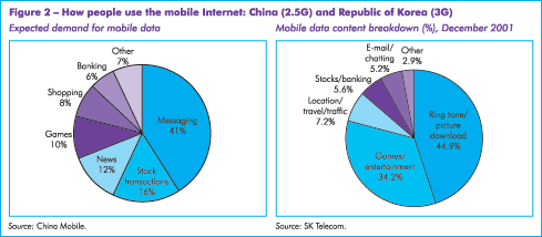 - The usage breakdown contrasts markedly with that of other countries. Compare with China in Figure 2. There, the main mobile data application is e-mail (41 per cent) followed by stock transactions (16 per cent) and news (12 per cent). These three categories account for two-thirds of the market demand in China, but only 13 per cent in the Republic of Korea. Once China acquires mobile data networks that run as fast as those in the Republic of Korea, then the two usage patterns may converge.