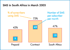 countries (left chart); and SMS users by type of subscription in March 2003 in
