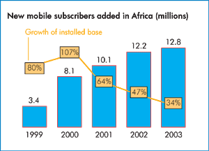 Number of new mobile subscribers added in Africa in the period 1999–2003 (left