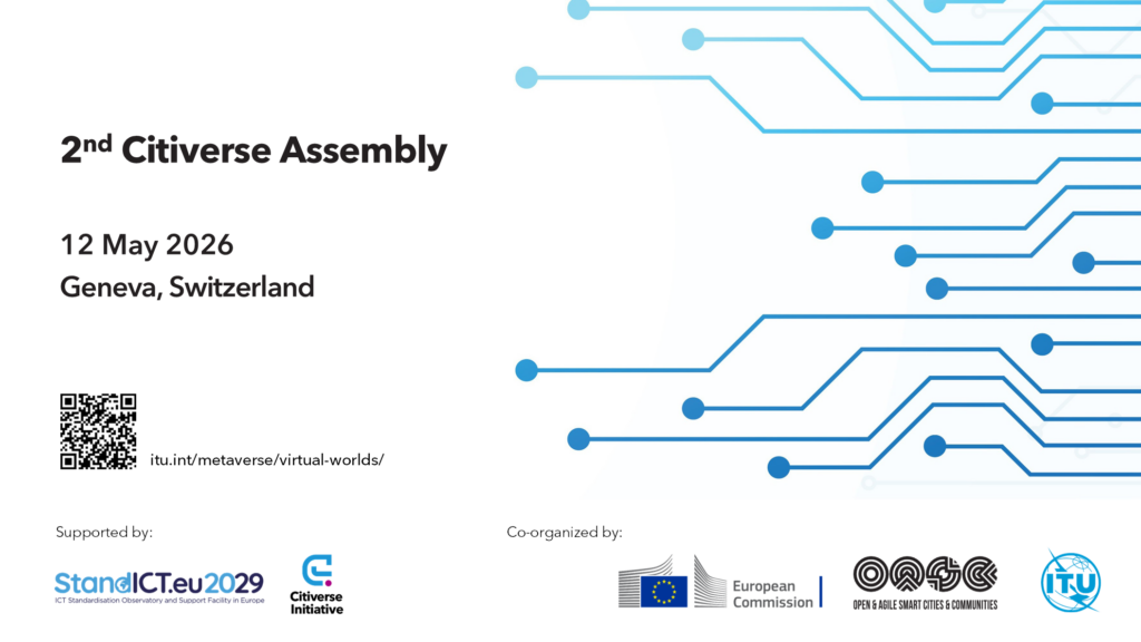 Co-organized by ITU, the European Commission and OASC, and supported by StandICT.eu 2029, the 2nd Citiverse Assembly convenes cities, governments, industry, standards bodies, research, and academia to strengthen global collaboration on the citiverse. The Assembly will share experiences from ongoing citiverse and local digital twin projects worldwide, present flagship deliverables of the Global Initiative on Virtual Worlds and AI – Discovering the Citiverse, and promote greater alignment across standards and implementation efforts.