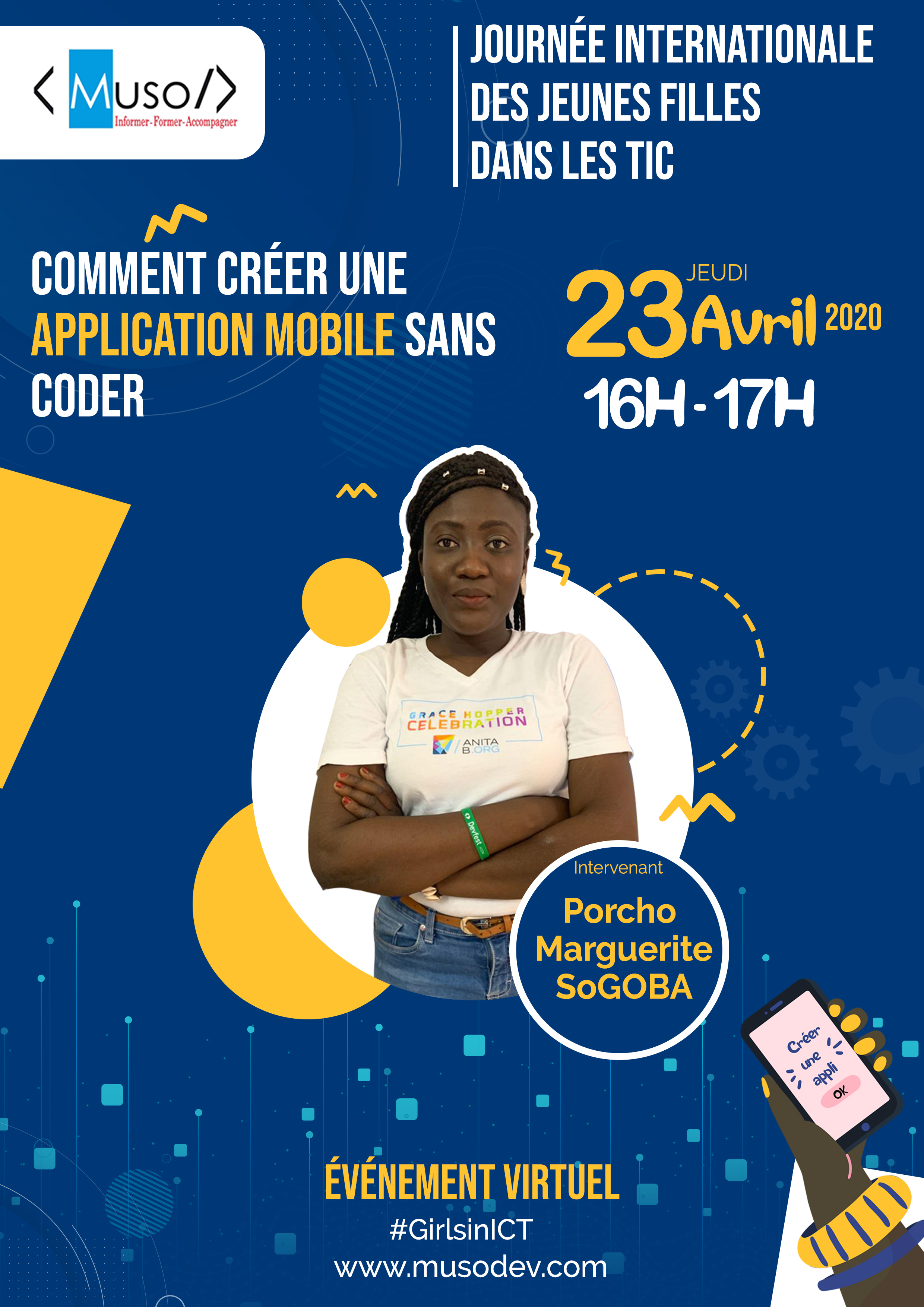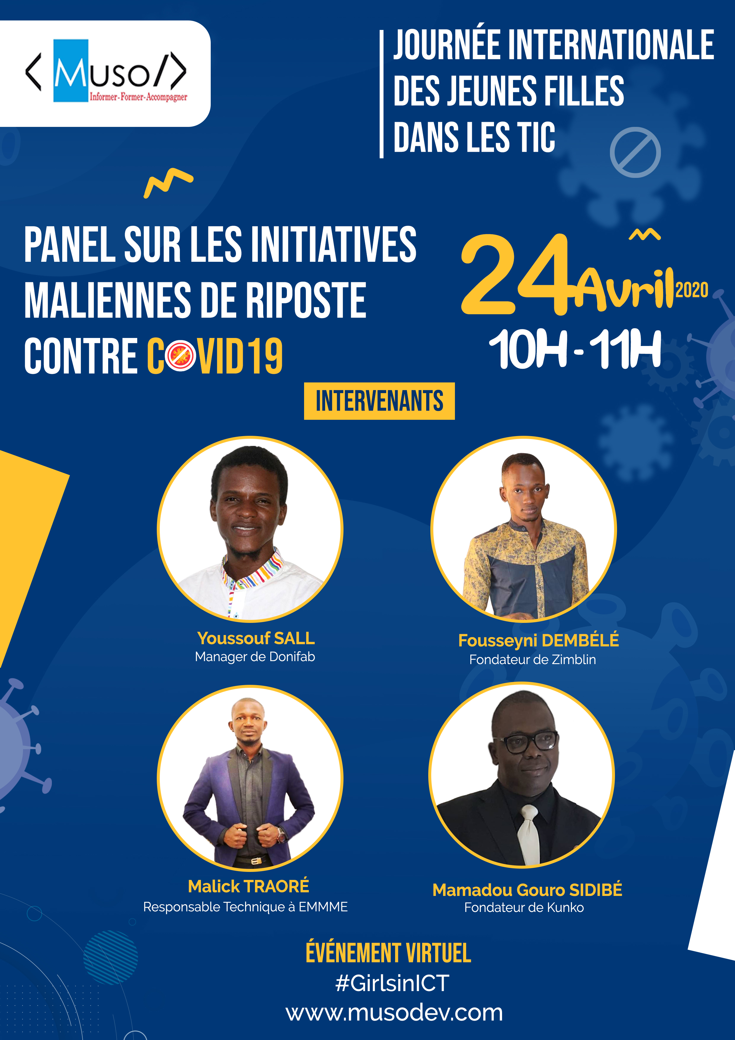 • To conceive, develop and promote the participation of women in ICT related professions, • Promote vocational training and support for women and girls through ICT. • Establish technological solutions allowing prevention as well as raising awareness on common problems of which women and young people are victims. In order to achieve its objectives, MUSODEV places great emphasis on awareness. That is why it cannot stay on the march for the international day of girls in ICT. Because of the health crisis in the world, activities will be done online. In order to reach the set objectives, various activities are on the program. Activity 1: discussion panel on the theme "Career opportunities and choices in ICT" Speakers: Dr Hamadoun Toure from Smart Africa, Nathalie Sidibé from Open Street Map, Ténin Samaké from Womanager, Dr Jacqueline Konaté from the Faculty of Science and Technology. Activity 2: Panel on RIPOSTE's Malian initiatives against COVID19 Speakers: Donifab, Robots Mali, Ministry of Digital Economy and Foresight Activity 3: Virtual workshops Class 1: How to create a mobile application without coding? Class 2: How to create your blog in 30 minutes? Class 3: The use of social networks in times of crisis