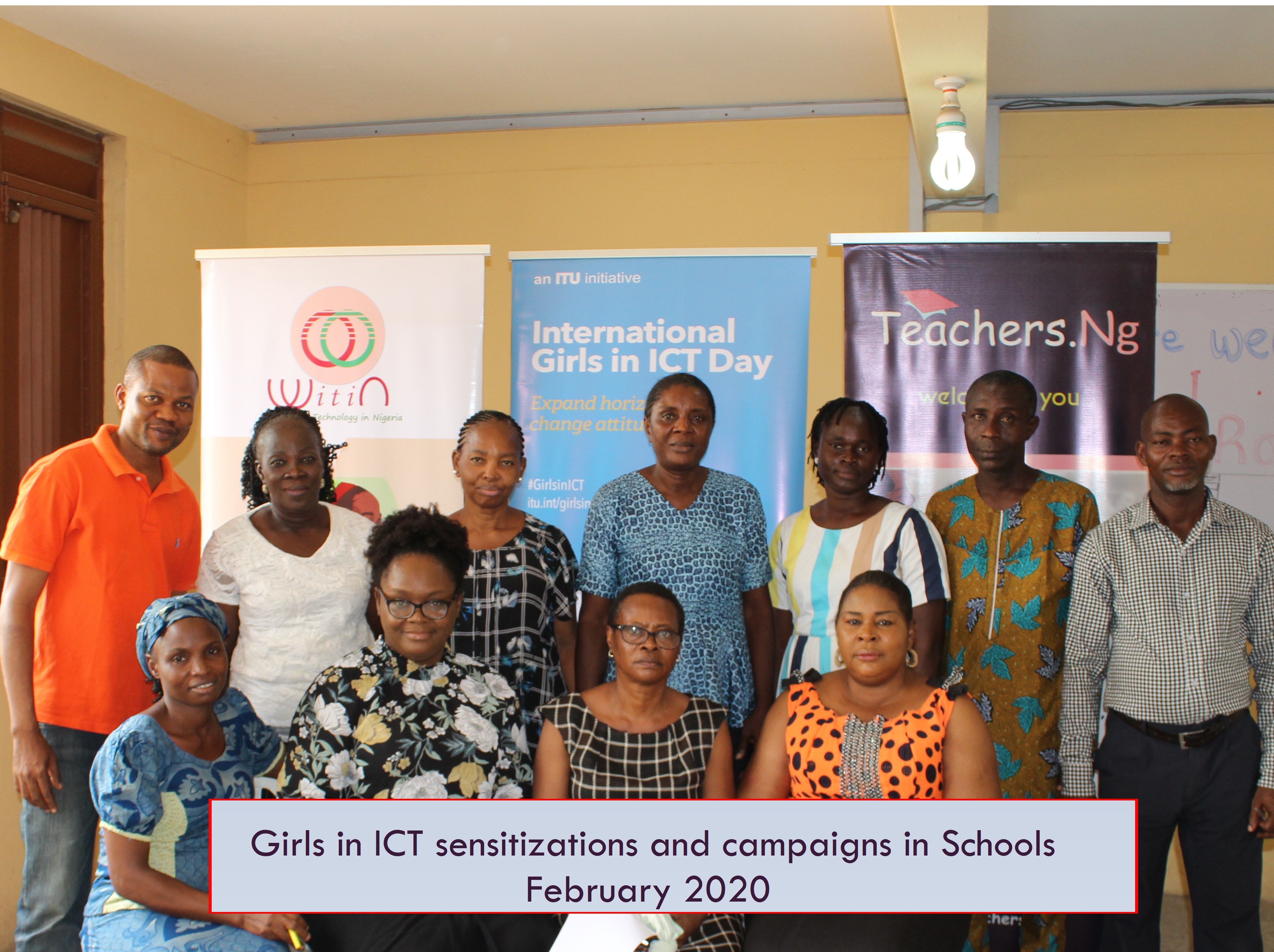 Women in Technology in Nigeria(WITIN) targets 5000 girls in Nigeria from ages 9-18 for Girls in ICT 2020 interventions. Girls are selected mostly from public schools and underserved communities. Via our teachers.Ng train the trainers network, girls would have hands-on face-to-face and online digital skills workshops from April 23, 2020 on: Leadership Skills Web-Development Mobile-Apps Application Video and Digital Story Telling Online Safety Coding Entrepreneurship Computational and Critical Thinking Robotics and AI IOT After the training, teachers would continue to mentor girls, guiding them to pick careers in STEM. Selected girls would also be given opportunities to intern. Selected schools would also have open days at ICT companies/Government agencies/Universities as well as ICT career fairs WITIN has started Girls in ICT sensitizations and campaigns in Schools with digital skills workshops for teachers and trainers, emphasizing their roles as key stakeholders & role models in bringing more Girls in ICT as preparation starts in earnest for our 2020 Girls in ICT Day Events