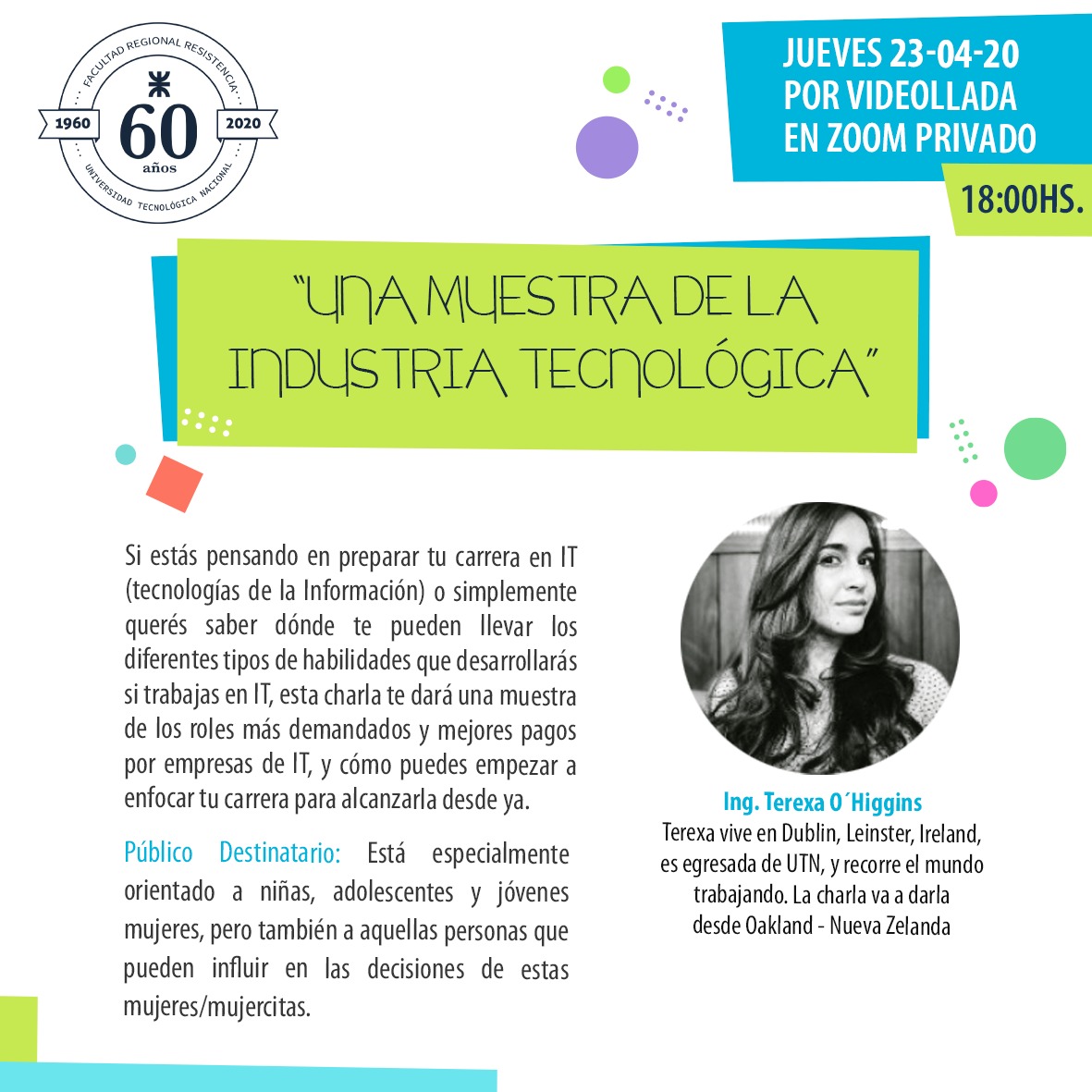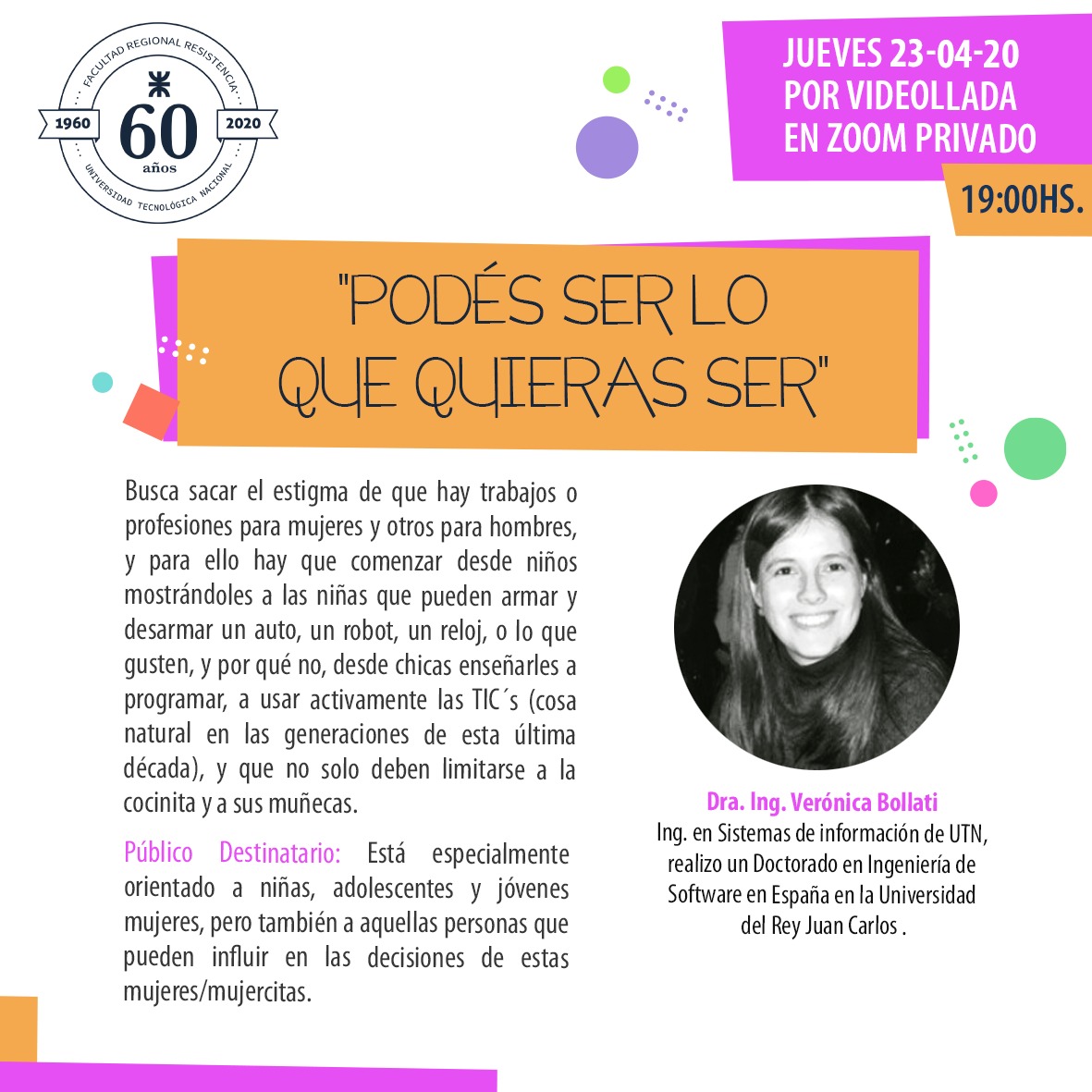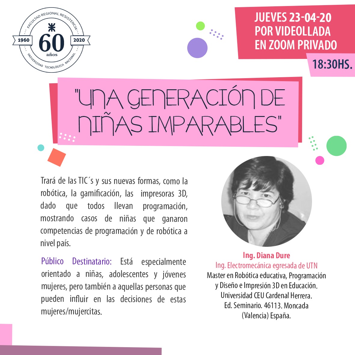 Si te interesa la igualdad de género, la igualdad deoportunidades laborales, y crees poder influir en que lasniñas/adolescentes/jóvenes, para que se vuelquen a las Tecnologías de laInformación y las Comunicaciones. Charlas: “Una muestra de la industria tecnológica”– Ing. Terexa O´Higgins Si estás pensando en preparar tu carrera en IT (tecnologíasde la Información) o simplemente querés saber dónde te pueden llevar losdiferentes tipos de habilidades que desarrollarás si trabajas en IT, estacharla te dará una muestra de los roles más demandados y mejores pagos porempresas de IT, y cómo puedes empezar a enfocar tu carrera para alcanzarladesde ya. "Podés ser lo que quieras ser" - Dra. Ing. VerónicaBollati Busca sacar el estigma de que hay trabajos o profesionespara mujeres y otros para hombres, y para ello hay que comenzar desde niñosmostrándoles a las niñas que pueden armar y desarmar un auto, un robot, unreloj, o lo que gusten, y por qué no, desde chicas enseñarles a programar, ausar activamente las TIC´s (cosa natural en las generaciones de esta últimadécada), y que no solo deben limitarse a la cocinita y a sus muñecas. Quepueden ser lo que quieran ser. "Una generación de niñasimparables" - Ing. Diana Dure Trará de las TIC´s y sus nuevas formas, como la robótica, lagamificación, las impresoras 3D, dadoque todos llevan programación, mostrando casos de niñas que ganaron competenciasde programación y de robótica a nivel país.