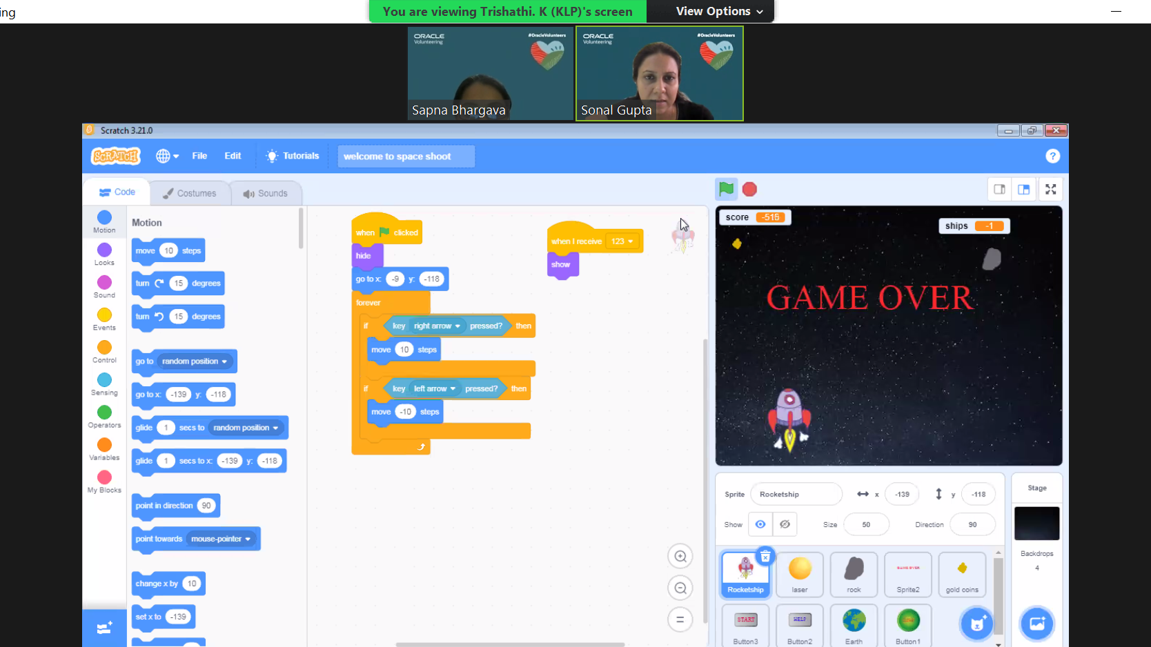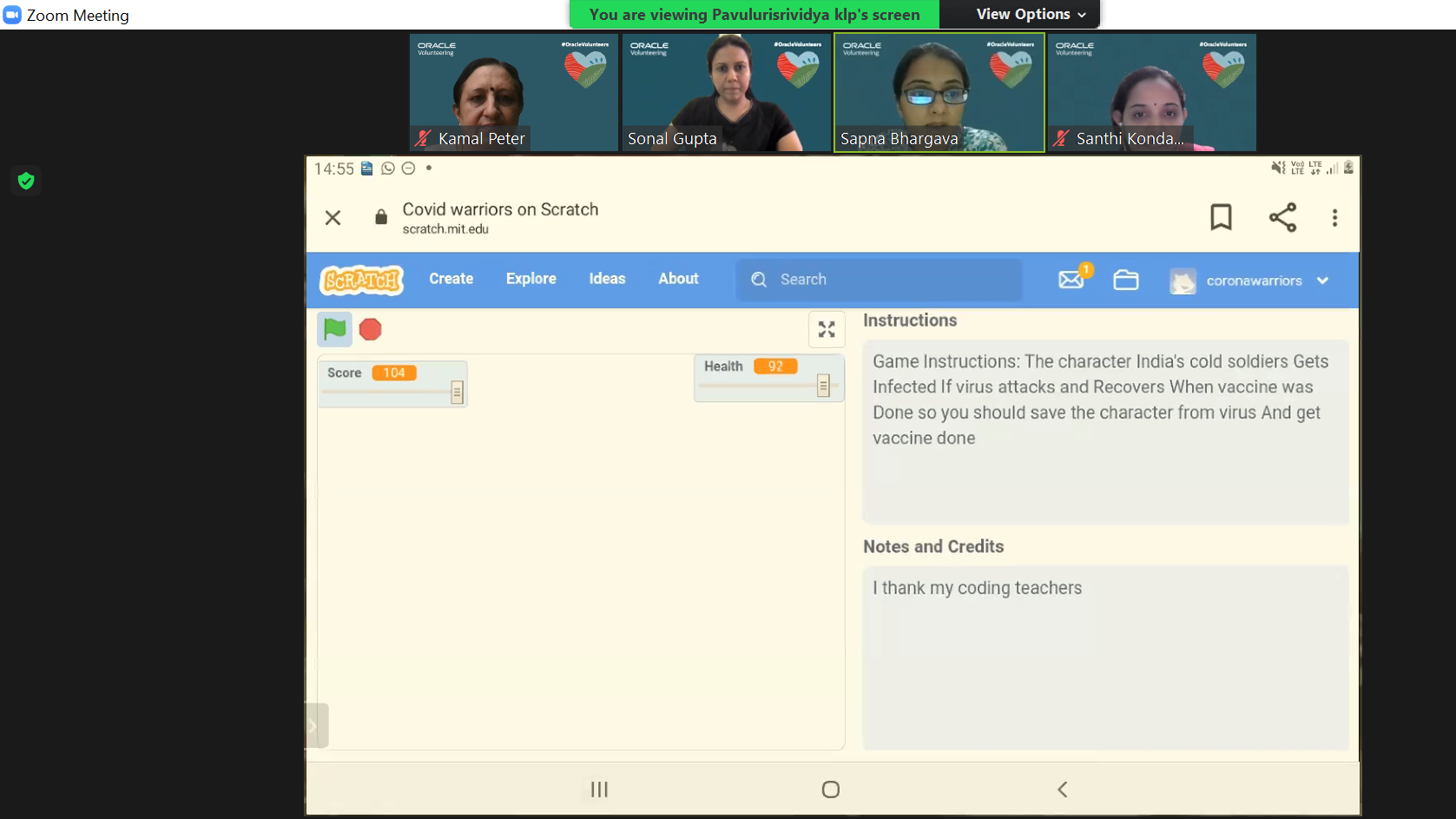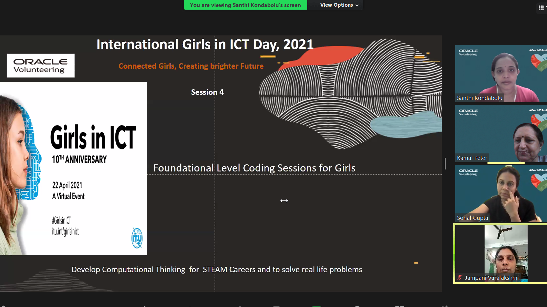 Oracle Volunteers offer this multi-session training to girls in smaller cities .Opportunities here are fewer and slower to reach. The project aims to increase representation of girls in courses and careers in Science Technology Engineering Arts and Mathematics (STEAM). It also aims to increase the confidence and performance of girls in these courses. An early initiation in a fun method, to computational thinking will make a huge difference to pursue STEM subjects. Though coding is seen as a highly technical skill, it is in fact, another form of literacy of 21st-century.It promotes logical thinking ,creativity, persistence, resilience, communication skills, structural thinking and problem solving skills. Girls from classes 7 and 8 participate and work along with the facilitator. They work on Scratch by Raspberry Pi Foundation. The participating schools are Dr. Kondabolu Lakshmi Prasad Public School and Vignan School at Guntur. Session 1 -7 APRIL- 4PM-5PM , Session 2 - 9 APRIL- 4PM-5 PM , Session 3 - 13 APRIL- 12Noon to 1PM, Session 4- 22 APRIL- 2PM to 3 PM