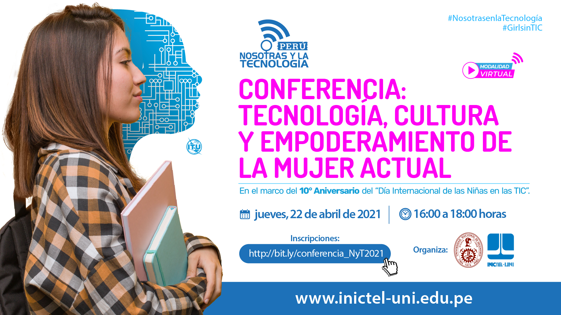 El INICTEL-UNI en el marco del 10º Aniversario del “Día Internacional de las Niñas en las TIC”, impulsado a nivel mundial por la Unión Internacional de las Telecomunicaciones - UIT, ha programado para el presente año la actividad Nosotras y la Tecnología: “Conectar a las niñas, crear futuros más brillantes”, con el objetivo de motivar a las mujeres adolescentes a familiarizarse con los conceptos de ciencias e ingeniería y lograr motivarlas a elegir una carrera profesional relacionada a las TIC.Es en este contexto que presentaremos la “Conferencia virtual Tecnología, Cultura y Empoderamiento de la Mujer Actual” el cual se realizará el jueves 22 de abril a las 16:00 h. y está dirigido para alumnas de 1ero a 5to año de educación secundaria y mujeres adolescentes de todas las regiones del Perú. Además, tendrá por objetivo alentar a las niñas y mujeres jóvenes de instituciones educativas, a considerar la posibilidad de orientar sus estudios y profesiones al campo creciente de las TIC a través de los diferentes casos de ingenieras que lograron empoderarse en sus carreras.Para participar de este evento se pueden inscribir en el siguiente link: http://bit.ly/conferencia_NyT2021