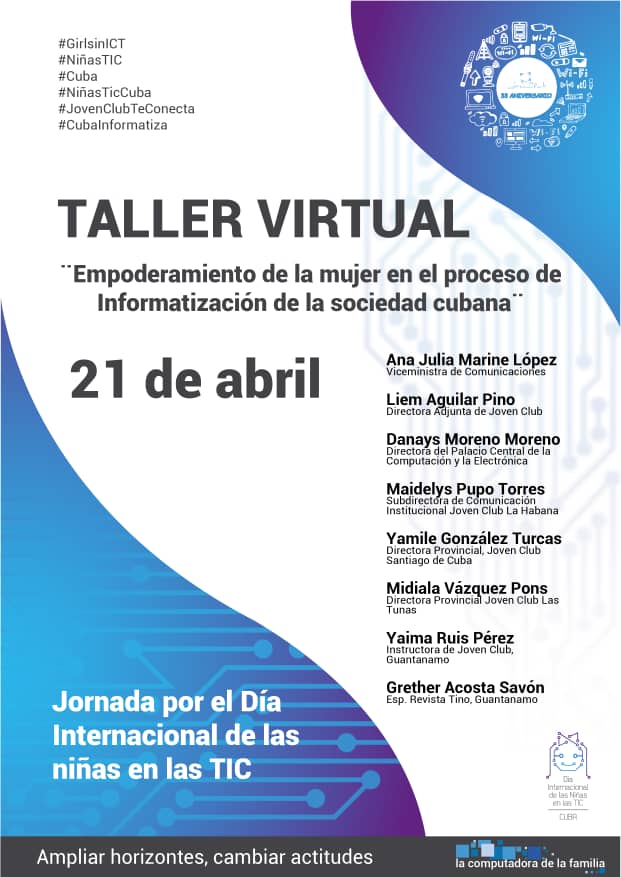 Este taller se realizará de forma virtual, a través de videoconferencia, participarán instructoras y directivas destacadas pertenecientes al Ministerio de Comunicaciones de la República de Cuba y a los Joven Club de varias regiones del país.