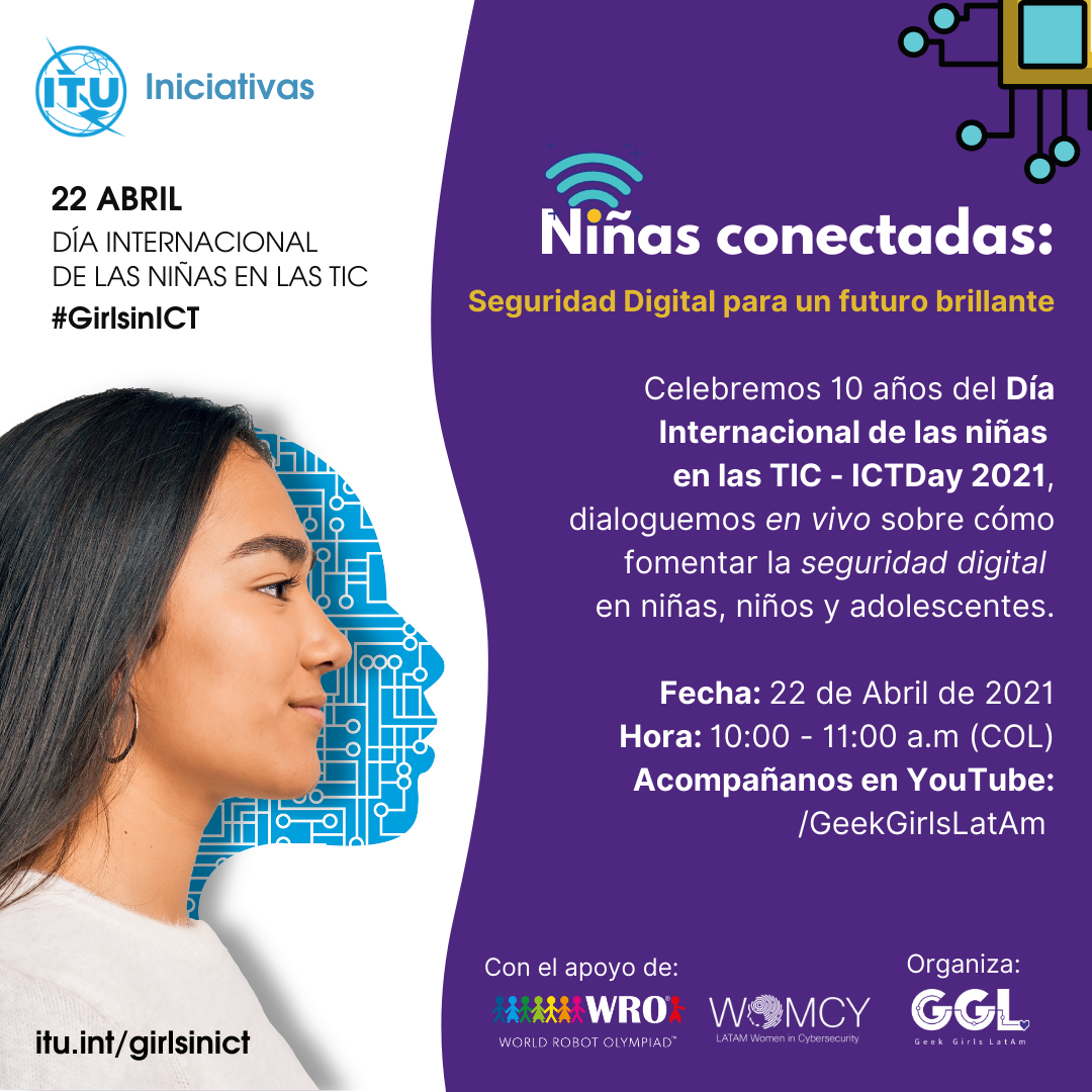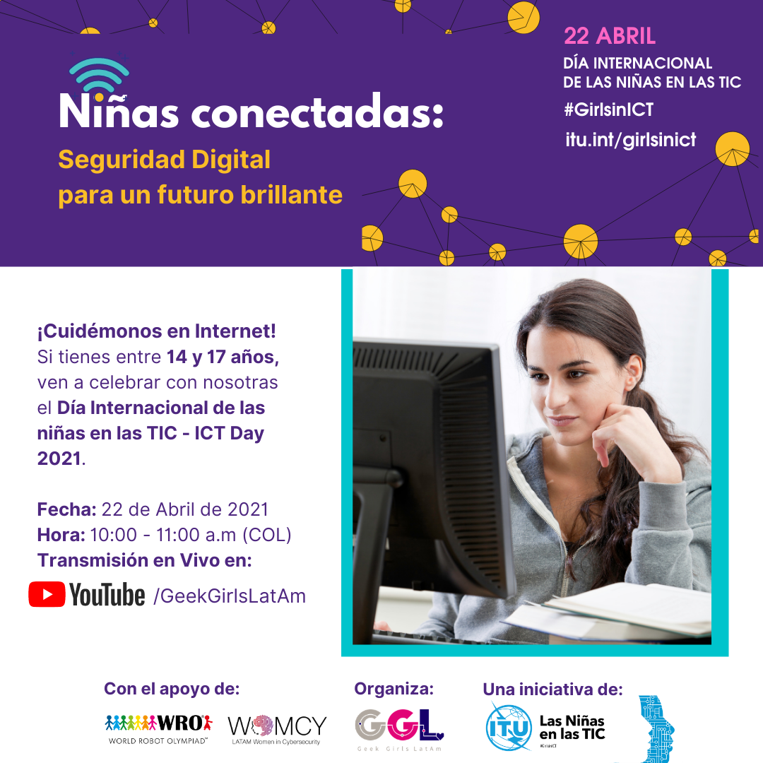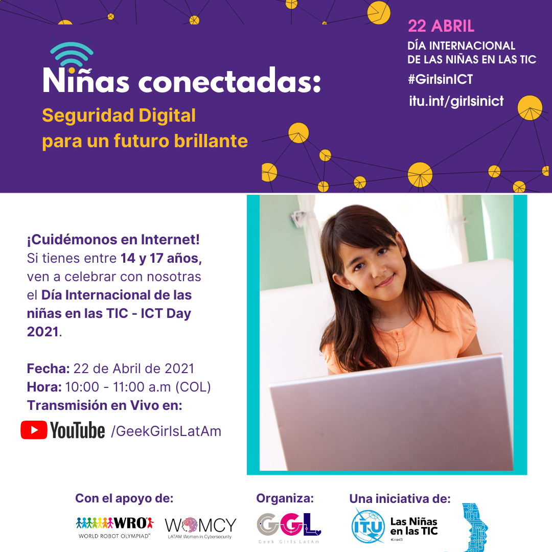22 de Abril - Acompáñanos en la celebración N. 10 del Día Internacional de las Niñas en las #TIC 👩🏻💻🦸🏻♀️#GirlsinTICNiñas Conectadas: Seguridad Digital para un futuro brillante #GirlsinICTCon las medidas de confinamiento por la pandemia se ha incrementado el tiempo que niñas, niños y adolescentes dedican a navegar por Internet, abriendo la puerta a un sin número de posibilidades de aprendizaje, pero también exponiéndolos a múltiples riesgos digitales cuando no cuentan con el acompañamiento u orientación adecuado. La #Ciberdependencia y el #Ciberacoso son algunos de ellos.Por ello, @geekgirlslatam, @womcy y @wro_colombia se unen a la conmemoración del décimo aniversario del "Día Internacional de las niñas en las TIC - ICT Day 2021", impulsado por la Unión Internacional de las Telecomunicaciones - @ituofficialExpert@s en estas temáticas estarán dialogando en vivo, acerca de cómo fomentar desde la infancia la seguridad digital: alertando, compartiendo información y herramientas de autocuidado, prevención y denuncia para mitigar los riesgos digitales que afectan a las #niñas y #adolescentes en un mundo cada vez más conectado.Fecha: Abril 22, 2021Hora: 10:00 am (COL)Dónde: Canal de YouTube de GeekGirlsLatam.