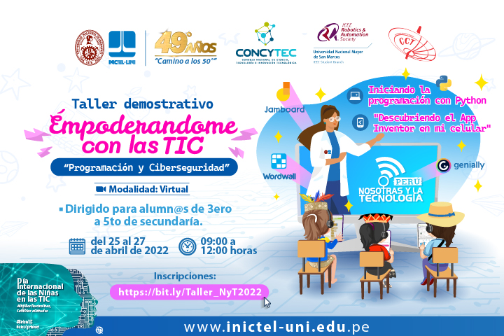 Este taller está dirigido a estudiantes de tercero a quinto de secundaria de los colegios públicos y privados a nivel nacional y tiene como objetivo motivarlas a familiarizarse tanto con conceptos como herramientas relevantes en el ámbito de las tecnologías de la información y comunicación (TIC), así como orientarlas para un mejor conocimiento y entendimiento de las carreras de ciencia e ingeniería.Los temas que se desarrollarán durante los tres días del evento (25, 26 y 27 de abril de 09:00 am a 12:00 pm) son: Iniciando la programación con Python, Descubriendo el App Inventor en mi celular, Jamboard, Wordwall y Genially. Las alumnas y alumnos que deseen participar deben inscribirse previamente en el siguiente enlace: https://bit.ly/Taller_NyT2022.