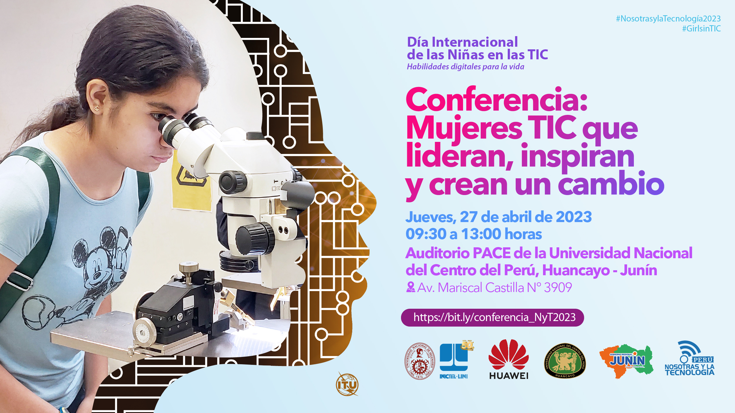 En el marco de la conmemoración del 50 aniversario del INICTEL-UNI, este año se celebrará el “Día Internacional de las Niñas en las TIC” con la actividad “Nosotras y la Tecnología”, en modalidad presencial. En la fecha central se desarrollará la conferencia “Mujeres TIC que lideran, inspiran y crean un cambio”, donde se contará con la participación de investigadoras peruanas para empoderar y alentar a las niñas y mujeres jóvenes a considerar la posibilidad de orientar sus estudios y profesiones al campo creciente de las TIC. Inscripciones: https://bit.ly/conferencia_NyT2023