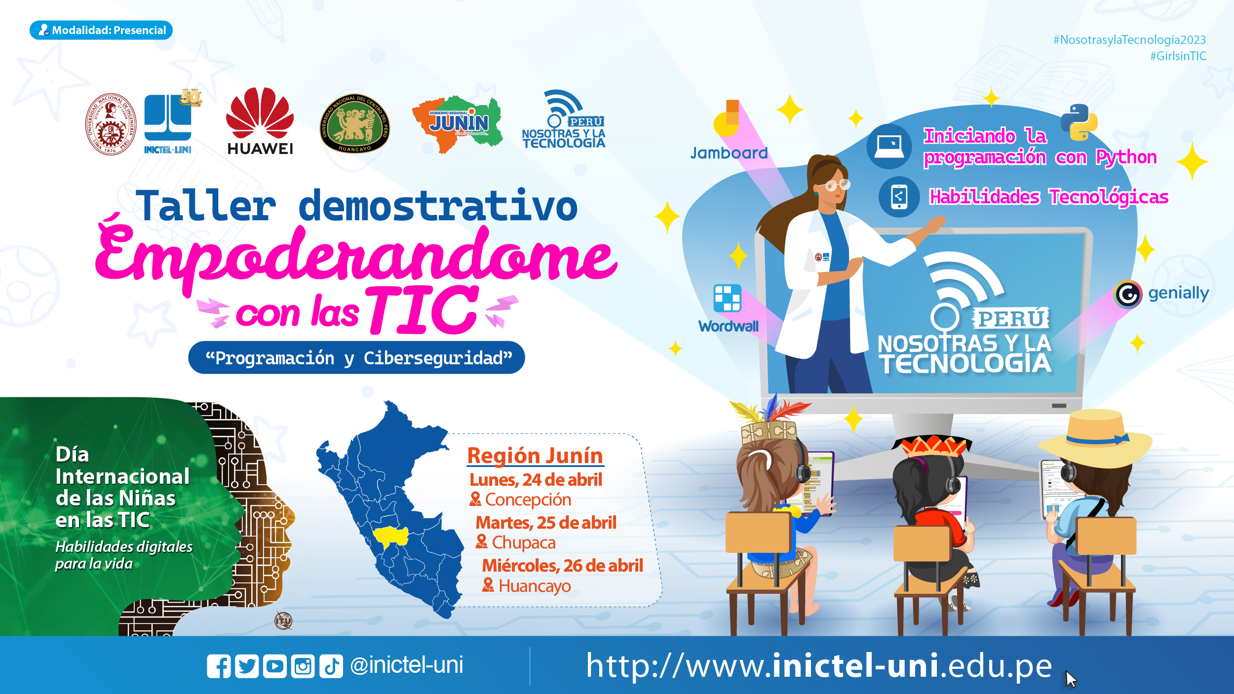 En el marco de la conmemoración del 50 aniversario del INICTEL-UNI, este año se celebrará el “Día Internacional de las Niñas en las TIC” con la actividad “Nosotras y la Tecnología”, en modalidad presencial. Del 24 al 26 de abril se impartirán talleres demostrativos y charlas de concientización en temas de programación con Python, ciberseguridad y habilidades tecnológicas para el aprendizaje.