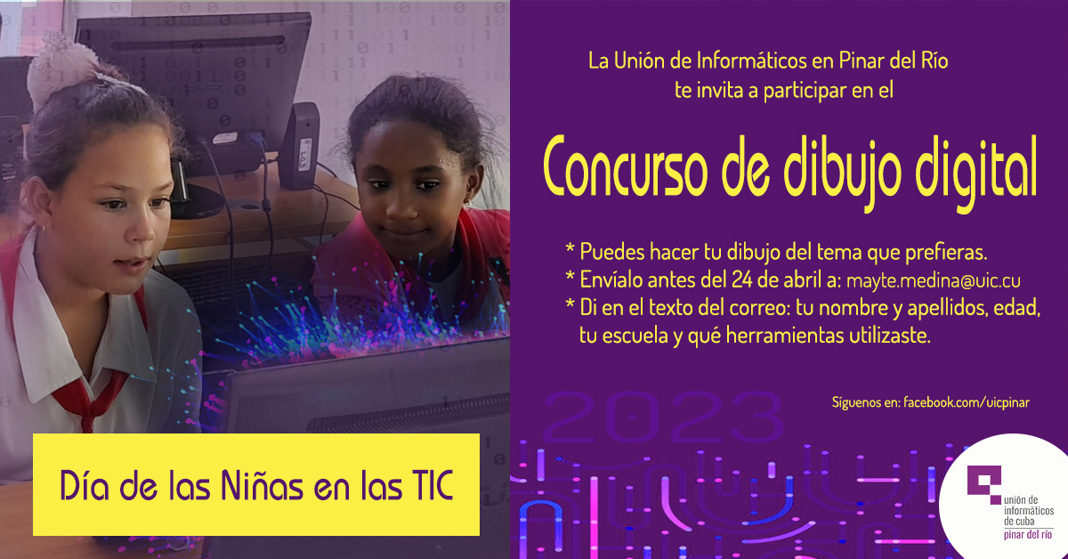 La Unión de Informáticos en Pinar del Río premiará a las niñas que participaron en el concurso por el Día de las Niñas en las TIC, en la modalidad de dibujo digital. Los dibujos fueron evaluados por un jurado, integrado por especialistas en informática, diseño y arte. Todos los trabajos serán expuestos en nuestras redes sociales. Se premiarán tres trabajos, teniendo en cuenta originalidad, diseño y calidad. La premiación será el día 27 de abril en la sede de la Unión de Informáticos en Pinar del Río.